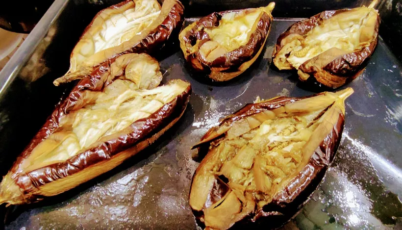 5. A padlizsánokat én a sütőben készítem, serpenyőben egy-egy vendégségre való adag nemigen férne el. A padlizsánt egyben vagy hosszában megfelezve napraforgóolajjal és sóval átdörgöljük, a tepsibe tesszük, és 200 fokon átsütjük. Ha egyben sütjük a padlizsánt, ajánlatos a hasát már a sütés előtt végigmetszeni. Nem kell megijedni tőle, ha pirítás közben egy kis pörkanyag is keletkezik úgy, mint amikor grillezünk.