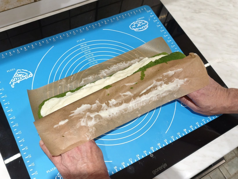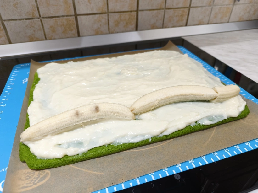 6. Amikor elkészült, kivesszük a tepsiből, és hagyjuk kihűlni. Végül egyenletesen elsimítjuk rajta a krémet, a banánokat a szélére tesszük, majd a képeken látható módon, szorosan feltekerjük.