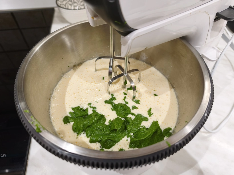 3. A spenótos piskótához a tojást a cukorral habosra keverjük, amíg ki nem fehéredik. Ezután a spenót következik: ha pürét használunk, egyszerűen a tojásos krémhez adjuk az olajjal együtt. Ha mirelit levelekkel készítjük, akkor azt kiolvasztás után lecsepegtetjük, jól kinyomkodjuk, majd az olajjal együtt turmixoljuk, és így keverjük hozzá a tojásos alaphoz.