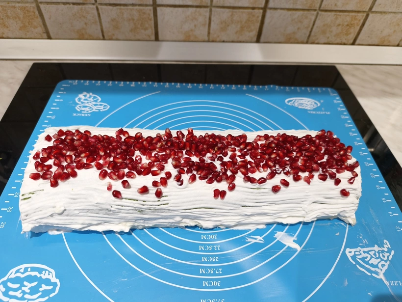 7. A tekercs külsejét bevonjuk a felvert habbal, a tetejét gránátalmamaggal vagy más gyümölccsel díszítjük.