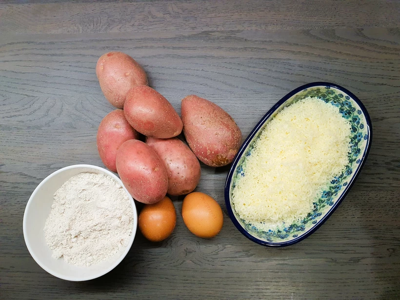 2. A krumpli a sótól enged egy kis nedvességet. Kicsavarjuk, de nem kell teljesen szárazra. Beleütjük a tojást, beletörjük a borsot, és kanalanként adagolva hozzákeverjük a lisztet. Sűrű masszát kell kapnunk, az a lényeg, hogy a krumplidarabkákat összetartsa a tészta. Ha nem elég sűrű, tegyünk még lisztet hozzá.