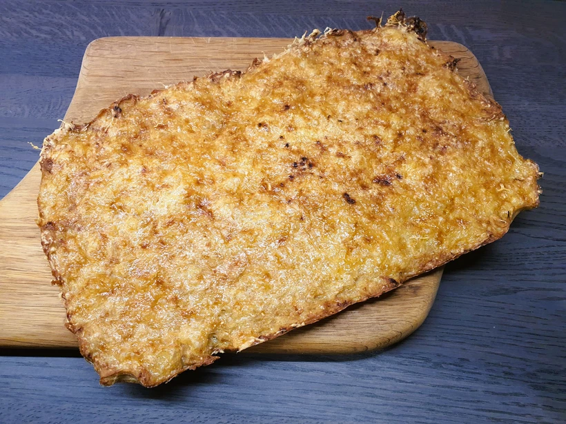 4. Sütőpapírral kibélelünk egy közepes méretű tepsit, belesimítjuk a masszát, a tetejét egyenletesen megszórjuk a reszelt sajttal, és betoljuk a sütőbe. Addig sütjük, míg a sajt meg nem pirul a tetején.