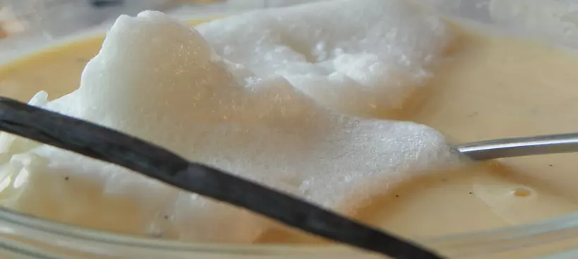 5. A cukros, tojássárgás masszába merjünk néhány evőkanállal a forró tejből, keverjük el, majd vékony sugárban csorgassuk vissza a vaníliás tejbe. A művelet végén a vaníliarudat emeljük ki a lábosból.