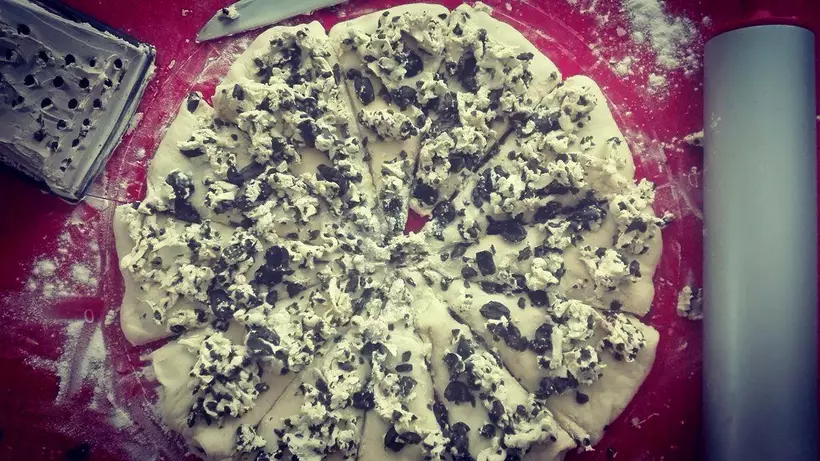 3. A tésztát lisztezett, éles kés segítségével 12 egyforma méretű szeletkére vágjuk, mint egy