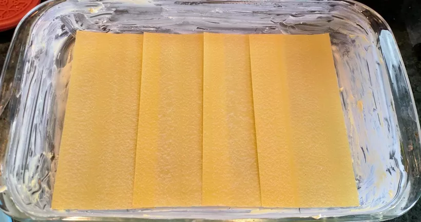 Egy téglalap alakú tűzálló edény alját kivajazzuk, majd belekanalazzuk a besamel negyedét, és szétterítjük benne. Ráhelyezzük a tésztalapocskákat, egymás mellé, ügyesen, hogy kitöltsék a tál alját. Az nem baj, ha a szélei egy kicsit egymásra lógnak.
