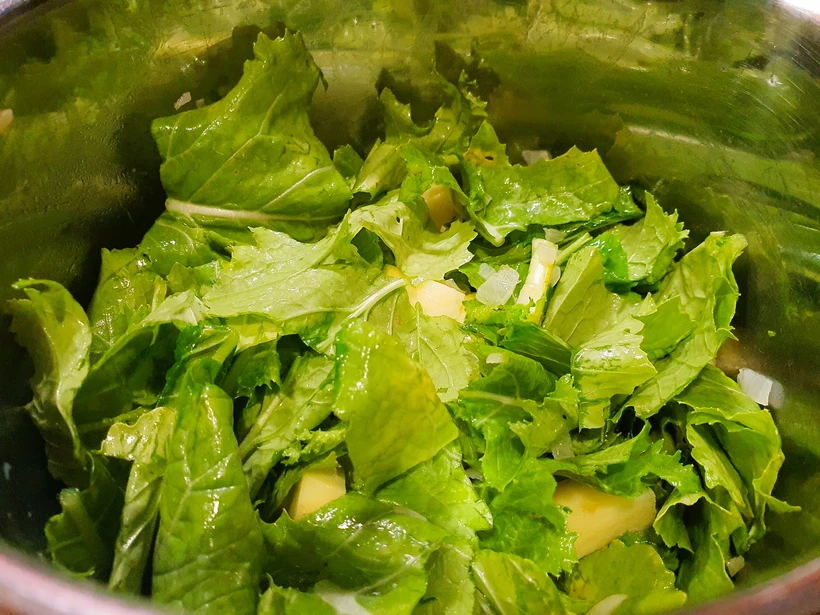3. Ha a hagyma megpárolódott, rádobjuk a felkockázott krumplit, és egy kicsit pirítjuk, közben durvára vágjuk a reteklevelet, és azt is a lábosba szórjuk. Összeforgatjuk, 1-2 percig pároljuk, majd felöntjük a húslevessel, sózzuk, borsozzuk, és addig főzzük, míg a krumpli meg nem puhul.