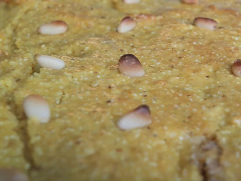 5. A tetejét szórjuk meg a fenyőmaggal, és tegyük be a 200 fokra előmelegített sütőbe. 20-25 perc alatt el is készül. (Néhány perc elteltével nézzünk rá, és ha nagyon pirulna a teteje, óvatosan borítsunk rá alufóliát!)