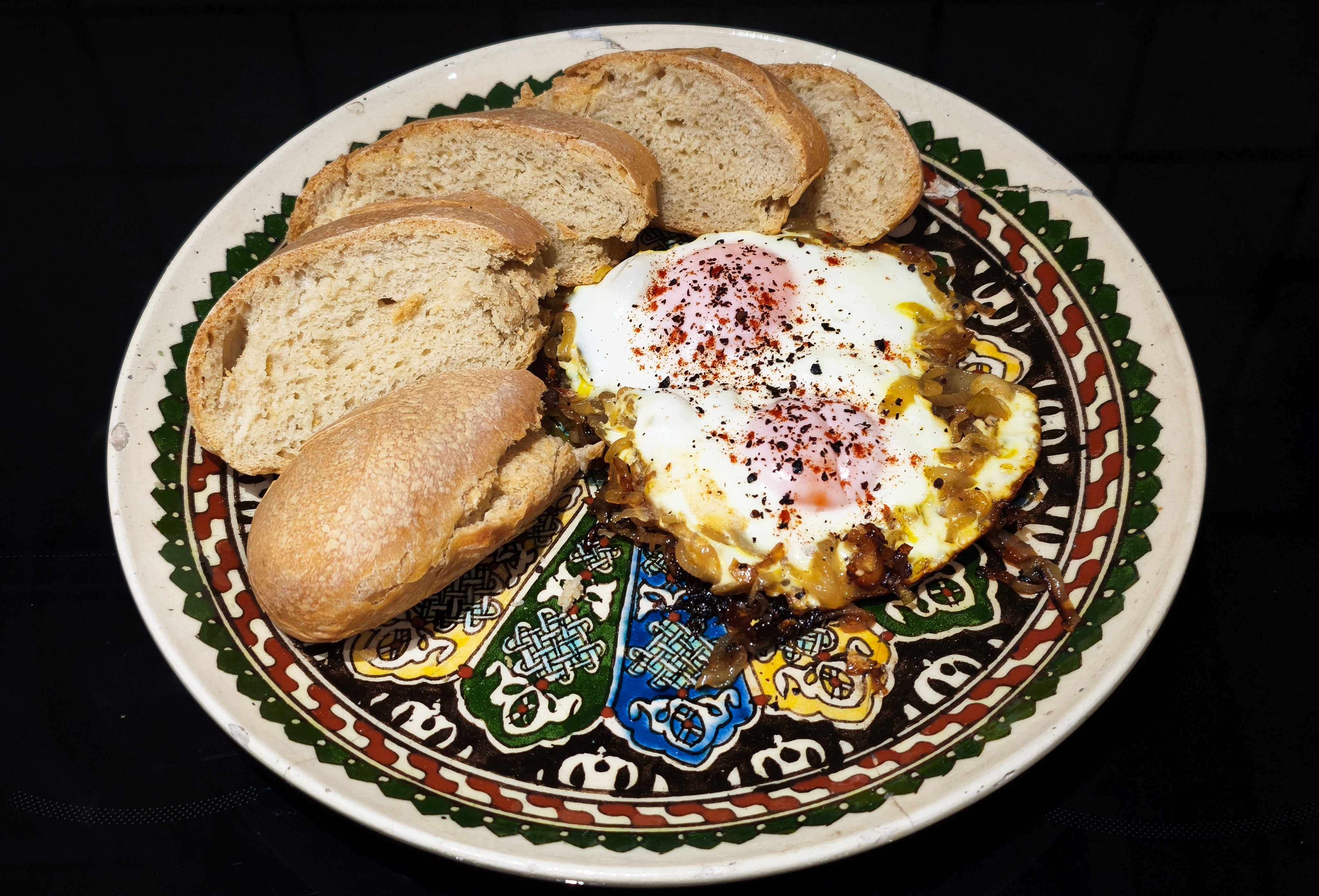 Idővel a soğanlama „leszivárgott” a palotából Anatólia különböző vidékeire, és számos helyi változata született. Közép-Anatóliában – Aksaray, Kırşehir környékén – a név alatt ma már gyakran húsos, esetleg tésztás egytálételeket értenek, máshol soğan mıhlaması, soğan öldürmesi vagy soğan aşı néven él tovább a hagymás-tojásos vonal. A Fekete-tenger mellékén a kıymalı soğan mıhlaması lett a reggelizőasztal sztárja: itt darált hús, paprika, paradicsom és tojás egészíti ki a sok hagymát. A mi receptünk ehhez a palotai eredetű, de ma már teljesen domesztikált, reggelizős soğanlama-vonalhoz kapcsolódik: kevés, de jó minőségű alapanyag, lassan párolt hagyma, a tetején lágyra hagyott tojásokkal – tökéletes mártogatós egy kosár friss, meleg kenyér mellé – ezért mutatok egy rendkívül egyszerű ropogóskenyér-receptet is hozzá.