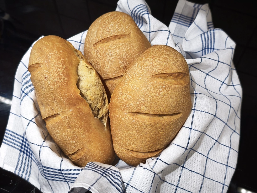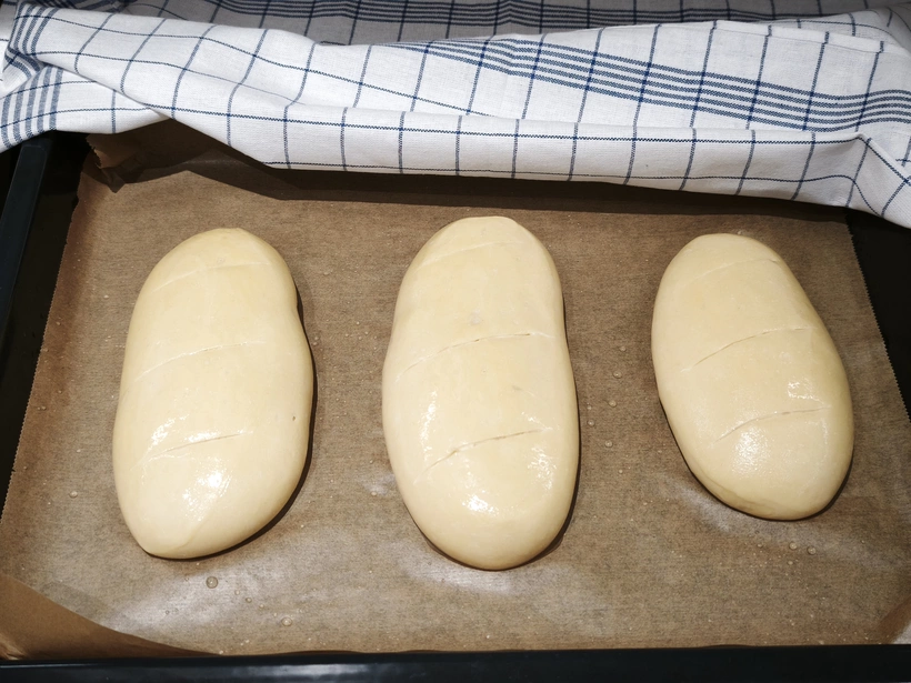 A tepsit kibéleljük sütőpapírral, beletesszük a három veknit, és letakarva további 30–40 percig hagyjuk kelni. Ha újra megkelt a tésztánk, egyszersmind kissé ki is szárad a felülete – ekkor a tetejüket nagyon éles késsel vagy borotvapengével három helyen fél-fél centi mélyen bevágjuk, majd átkenjük őket egy kevés vízzel. Végül 200 fokra előmelegített sütőben – legkeverés nélkül – 30-40 perc alatt kisütjük.