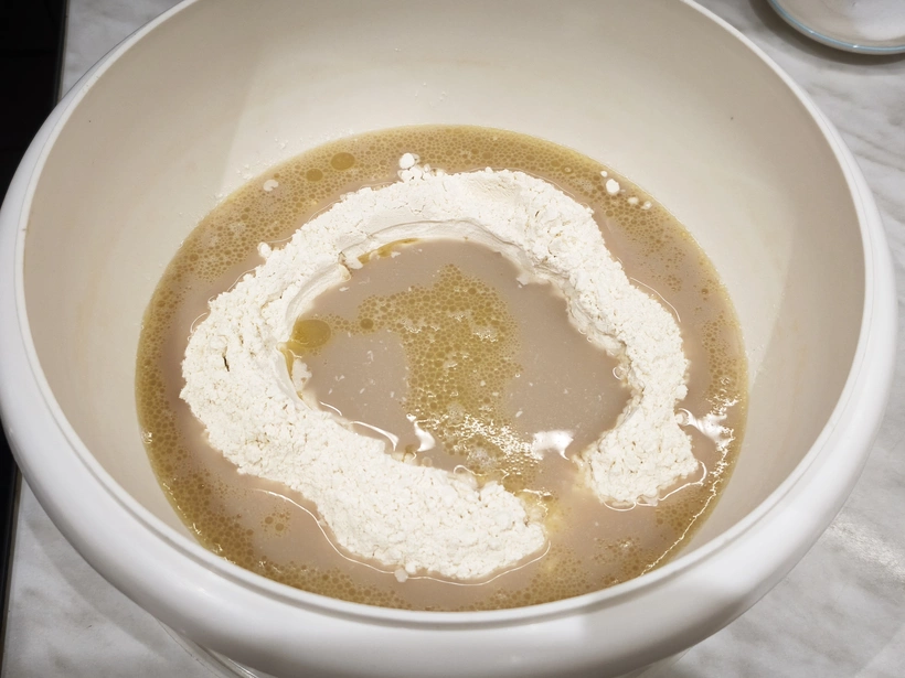 A tészta aznap készített, gyors verziója szerint a langyos vízben megfuttatjuk az élesztőt, hozzáadjuk a sót és az olívaolajat, majd a lisztet, és meggyúrjuk a tésztát.