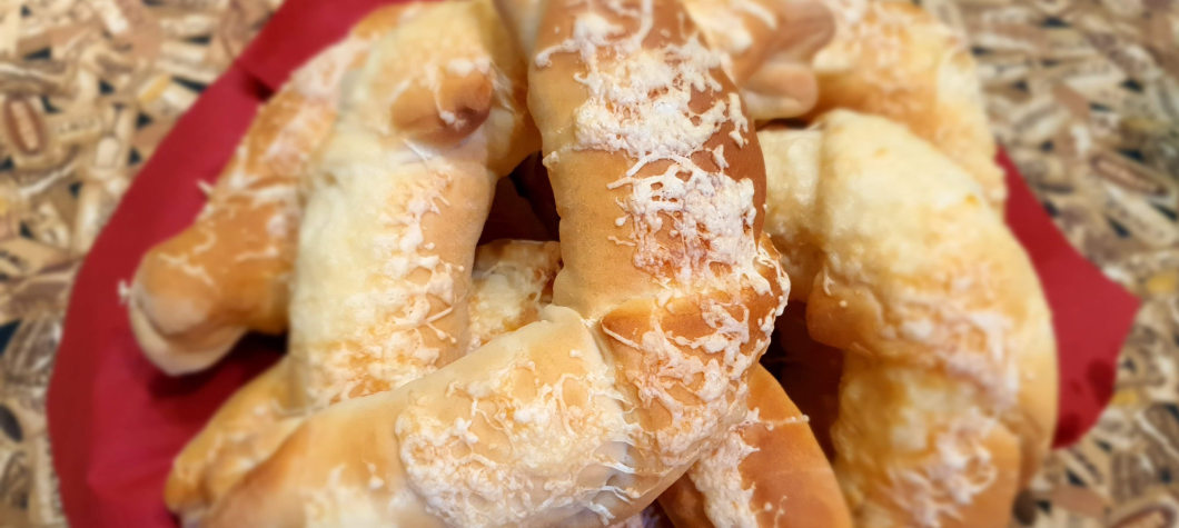 7. Újabb 15 perc pihentetés következik, majd a kifliket lekenjük vízzel, és ha szeretnénk, most rászórhatjuk a sajtot, a mákot, a szezámmagot, a sót vagy amit gondolunk, de maradhat csupaszon is. Mi most reszelt sajttal szórtuk meg.