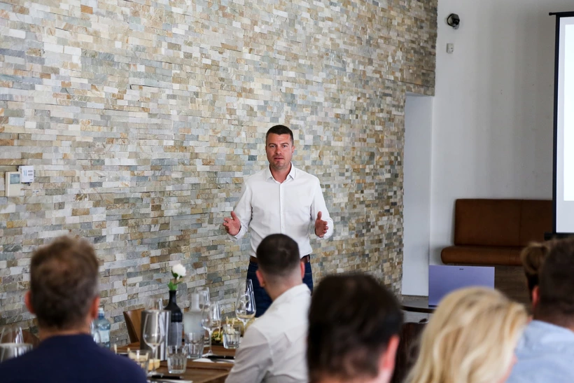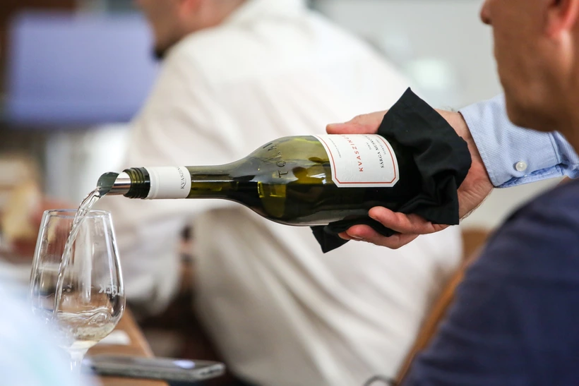 Nézegetem a negyedik generációs Kvaszingert, amint ellenőrzi a kivetítőt, készülődik az előadáshoz, és közben szemét néhányszor végigfuttatja a termen. Borkereskedők, sommelier-k, borszakértők és szakírók ülnek az asztalok körül, akik azért jöttek össze, hogy megismerjék a Kvaszinger Borászat új címkecsaládját és a legújabb, dűlőszelektált borokat. Izgalmas délutánnak nézünk elébe, 10 bor kerül a poharunkba, közülük az elsővel, a Pukkancs nevű 2024-es habzóval már van is alkalmunk ismerkedni. Furmint és hárslevelű házasítása, frissítő és könnyed, éppen üdvözlőitalnak való, biztosan szereti a közönség.
