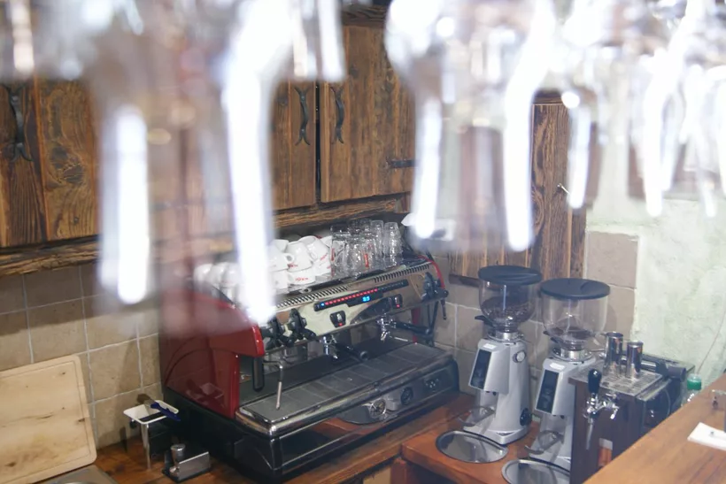 A hely hangulata igazi „régipincés”, és ha nem tudnánk, hogy kávé is van, aligha jutna eszünkbe kérni, ám ha jobban körülnézünk, észrevehetjük a modern kávégépet az öreg pult mögött. A parányi fogadótér tényleg családias, 12 szék van mindössze, de ez egy baráti társaságnak éppen elég. Ha pedig nagyobb csapat érkezne, ott a fűtött pince, ahol a kupola alatt negyven ember is kényelmesen elfér, de a csöppnyi terasz is működik, amíg tart a jó idő.
