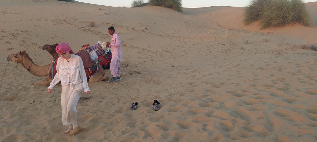 Utazásunk legturistásabb eseményén, egy csoportos sivataglátogatáson veszünk részt a franciákkal, és két holland utazóval. Nincs más alternatívánk, ha ki szeretnénk menni a Thar-sivatagba. Sztyeppés erdős szakaszokon utazunk át, elhagyott települések mellett haladunk el a pusztában. A sivatagban beáll a nyugalom. Még úgy is, hogy egyikünknek néha le kell pattani a teve hátáról hányni egyet. Mivel a csapatban mindenki nehezebb nálunk, mi kapjuk a leglepukkantabb tevéket – bár a daliásabbakon se lehet sokkal kényelmesebb az utazás.