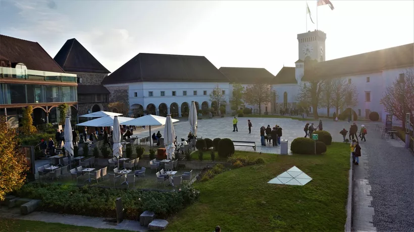 Ha már eleget ettünk-ittunk, és némi mozgásra vágyunk, akkor célba vehetjük a várat (Ljubljanski grad), amely a piac mögötti kis utcán át könnyen megközelíthető, de a kényelmesebbek számára sikló is rendelkezésre áll a Krekov téren. A sétát választva erdei ösvényeken vezetett az utunk, egy rozsdaszínű erdő napfény festette lombjai között. Egy darabig csak napoztunk, és egy kávé mellett – ki tudja, miért – a panorámát csodáltuk odafönn, a „szlovén Akropoliszban”.