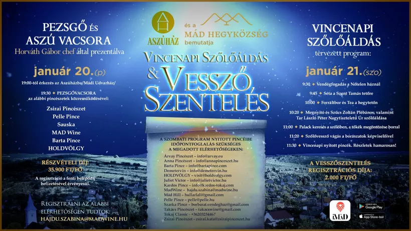 A Holdvölgy Experience kezdeményezésének köszönhetően az elmúlt években Mád sem marad ki a Vince-napozásból – a hegyközség és az itteni borászatok két napot is megtöltenek programokkal. Péntek este pincelátogatásokon vehetnek részt az érdeklődők, az Aszúházban pezsgő- és aszúvacsorához terítenek.