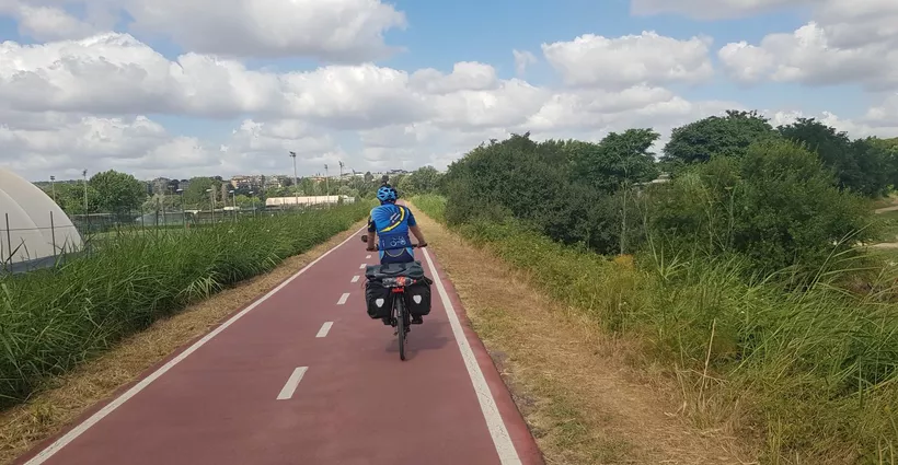 Az első 20 km szörnyű volt, főút, hatalmas forgalom. Ezután a Garmin leterelt egy csodálatos kerékpárútra, ami szinte bevitt bennünket a Vatikánba. Kb. 20 kilométernyi kerékpáros álom. Igaz, hogy nagyjából 5 kilométerrel volt hosszabb, mint amit a Mapy vagy a Google tervez, de minden métere megérte.