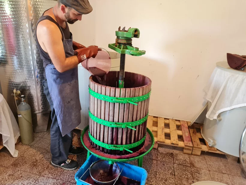 A cefreszivattyú pépesíti a gyümölcsöt, hogy egy csövön szállítható, homogén anyaggá váljon. Biztos jó úgy is, de nekünk nem tetszik. A prés egy 200 literes, fakosaras, orsós darab a kései ’70-es évekből. Egy ember elbírja a fél préskosarat, kézzel be lehet érni az aljára, egy nagyobb levegővel – üresen – odébb tolható, szóval minden tekintetben ideális. Ha megtelt, keményfa hasábokból egy felfelé szűkülő gúlát kell építenünk, majd kezdődik a préselés. Lassan, türelmesen, épphogy csak csorogjon, ne tömődjenek el a mustutak belül. A musttal vagy borral megtelt vödröt felemeljük és tartályba vagy hordóba öntjük. És a feldolgozás itt véget is ér.